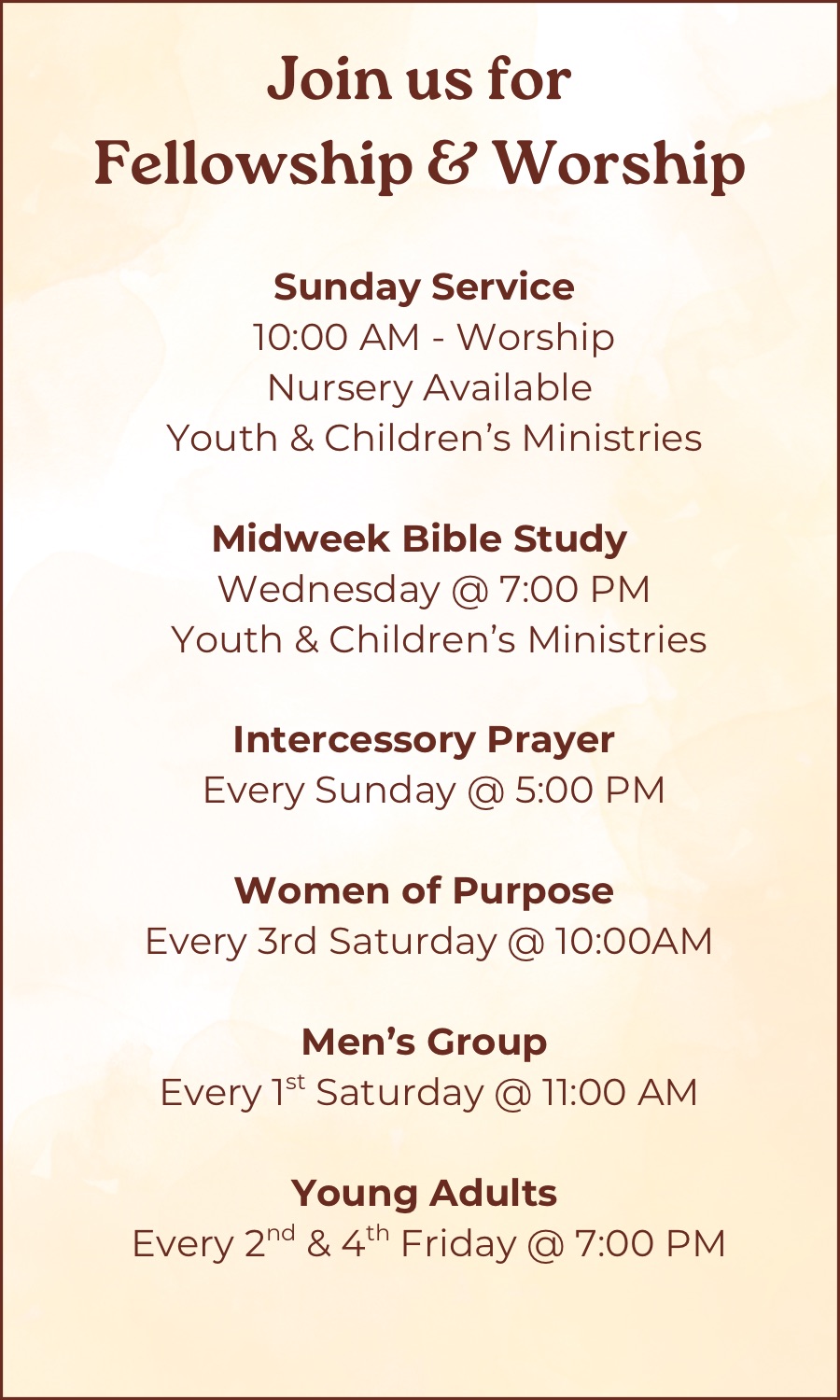 We gather on the 2nd and 4th Friday at 7PM each month to connect, grow and seek God together.
